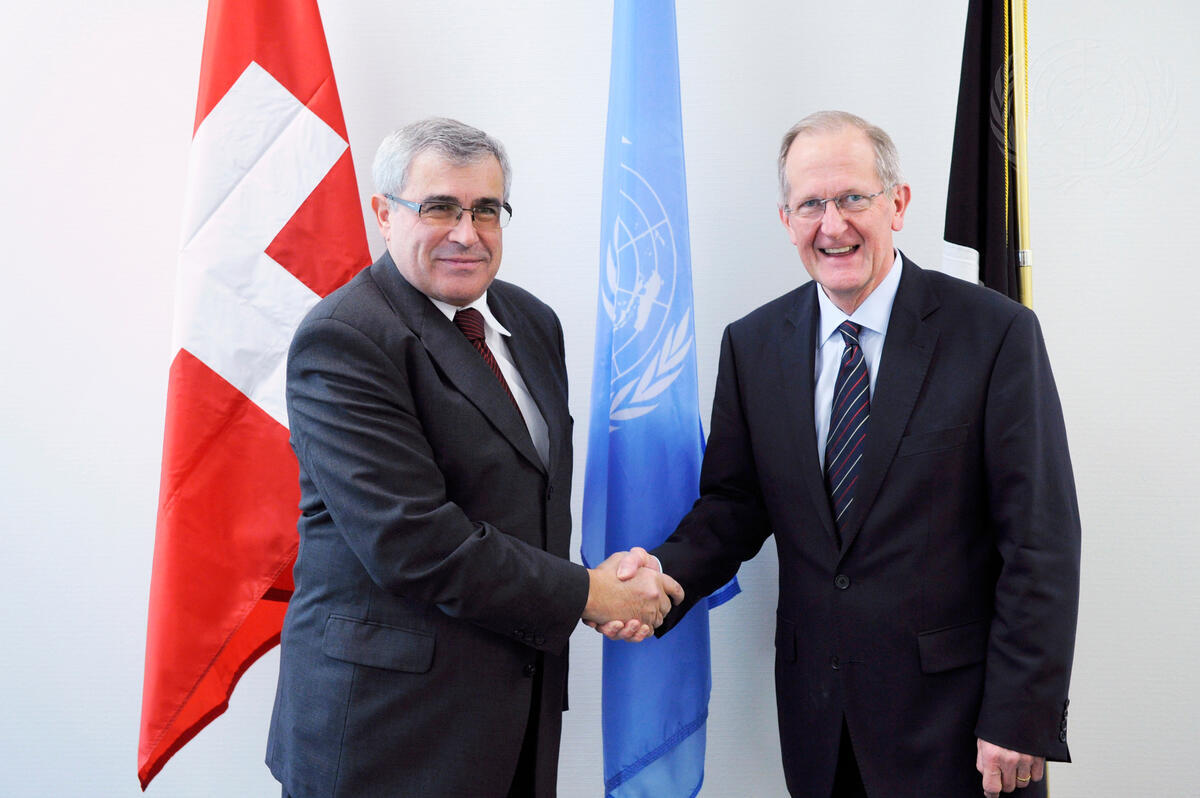 Joseph Deiss (right), President of the sixty-fifth session of the General Assembly, meets with Sven Alkalaj, Minister for Foreign Affairs of Bosnia and Herzegovina.