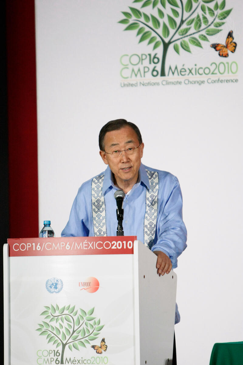 Secretary-General Ban Ki-moon addresses the High-Level Advisory Group on Climate Change Financing (AGF), during the United Nations Climate Change Conference (COP16) in Cancun, Mexico.