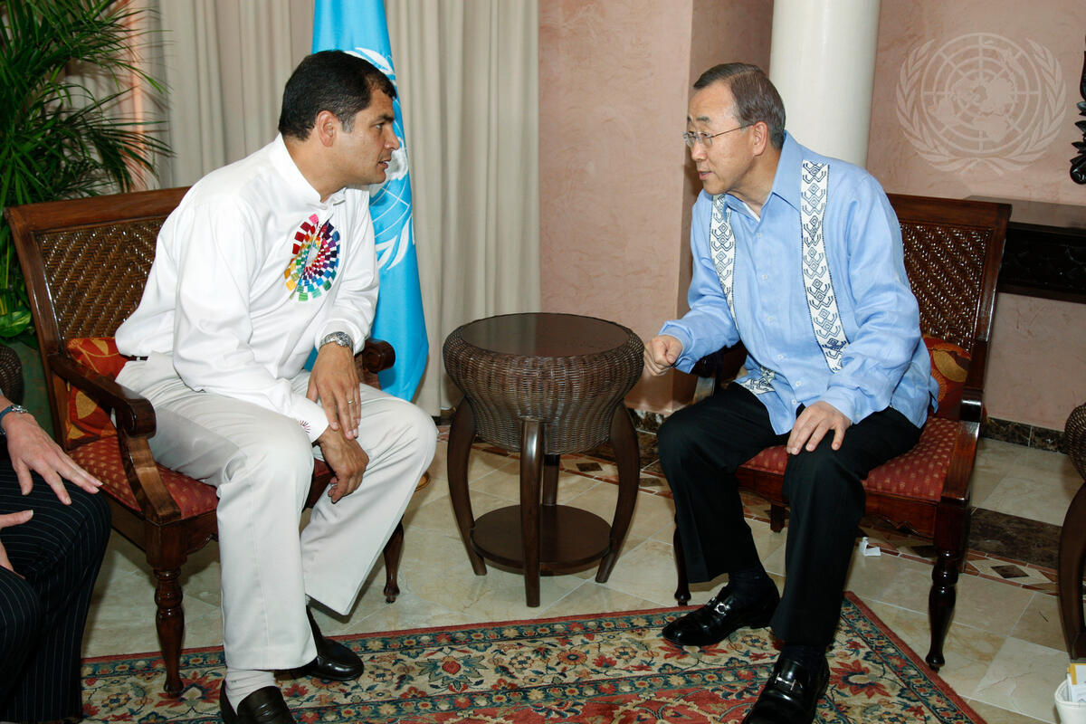 Secretary-General Ban Ki-moon (right) meets with Rafael Correa, President of Ecuador, at the United Nations Climate Change Conference (COP16) in Cancun, Mexico.