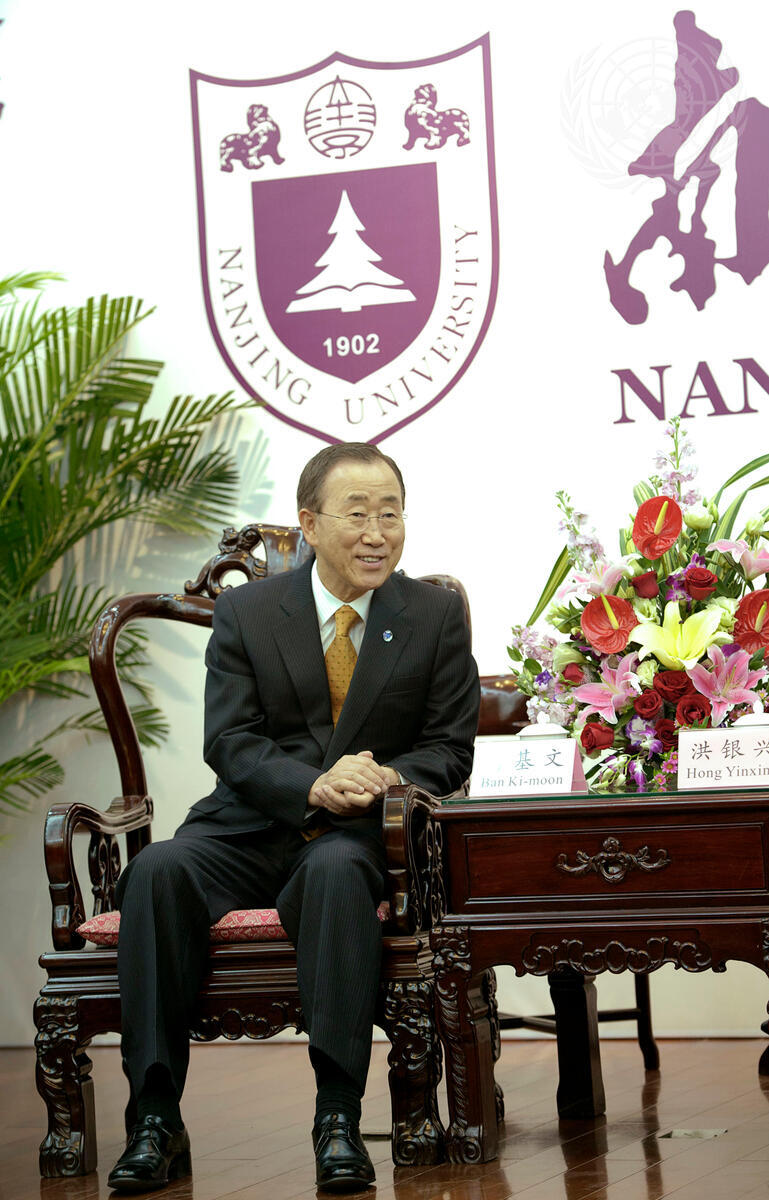 Secretary-General Ban Ki-moon, as he chats with University officials, prior to receiving an honorary doctorate from Nanjing University.