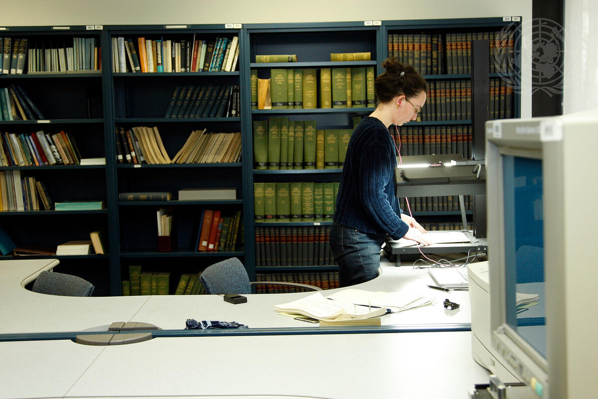 A researcher examines documents at the UN Archives and Records Management Section (ARMS) reference service area. ARMS ensures that the UN and the public have ready access to records and archives that document the history of the United Nations.
