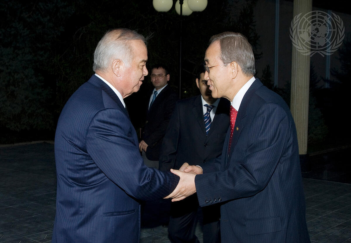 Secretary-General Ban Ki-moon (right) greets Islam A. Karimov, President of the Republic of Uzbekistan, before attending a dinner with Mr. Karimov in Uzbek capital Tashkent.