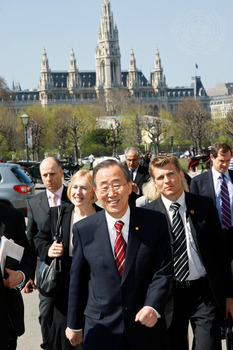 Secretary-General Ban Ki-moon (front) is pictured on his way to a meeting with the Permanent Council of the Organization for Security and Co-operation in Europe (OSCE) in Vienna, Austria.