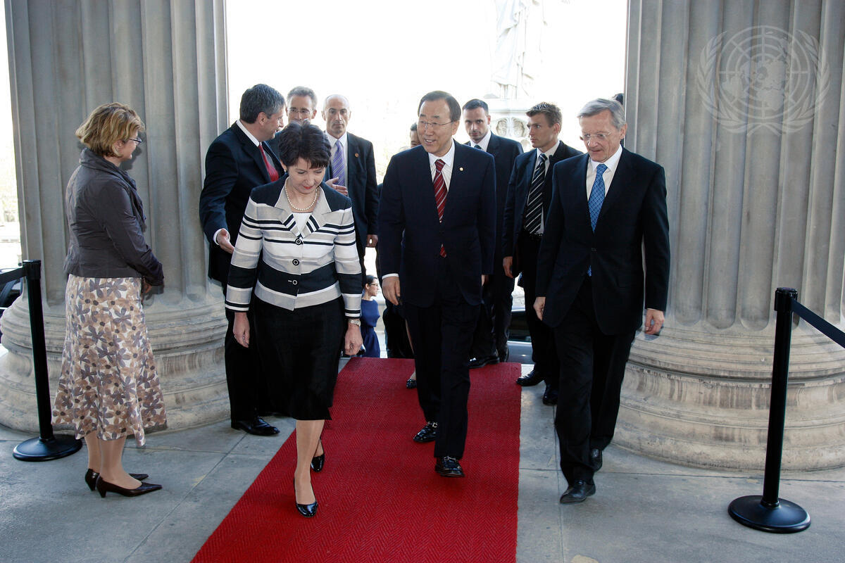 Barbara Prammer (front, second from left), President of the National Council (Austria's lower house of Parliament), guides Secretary-General Ban Ki-moon (second from right) into the Austrian Parliamentary Building where Mr. Ban addressed the Foreign Policy and United Nations Association of Austria (UNA-AUSTRIA).