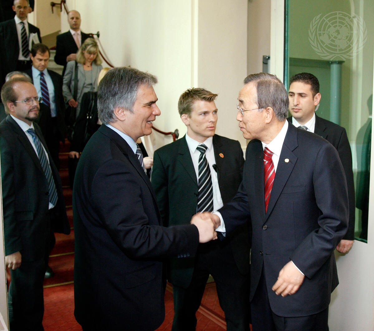 Secretary-General Ban Ki-moon (right) meets with Austrian Federal Chancellor Werner Faymann at the Kongress-Saal--the official venue for state banquets and the Chancellor's press conferences--in Vienna, Austria.
