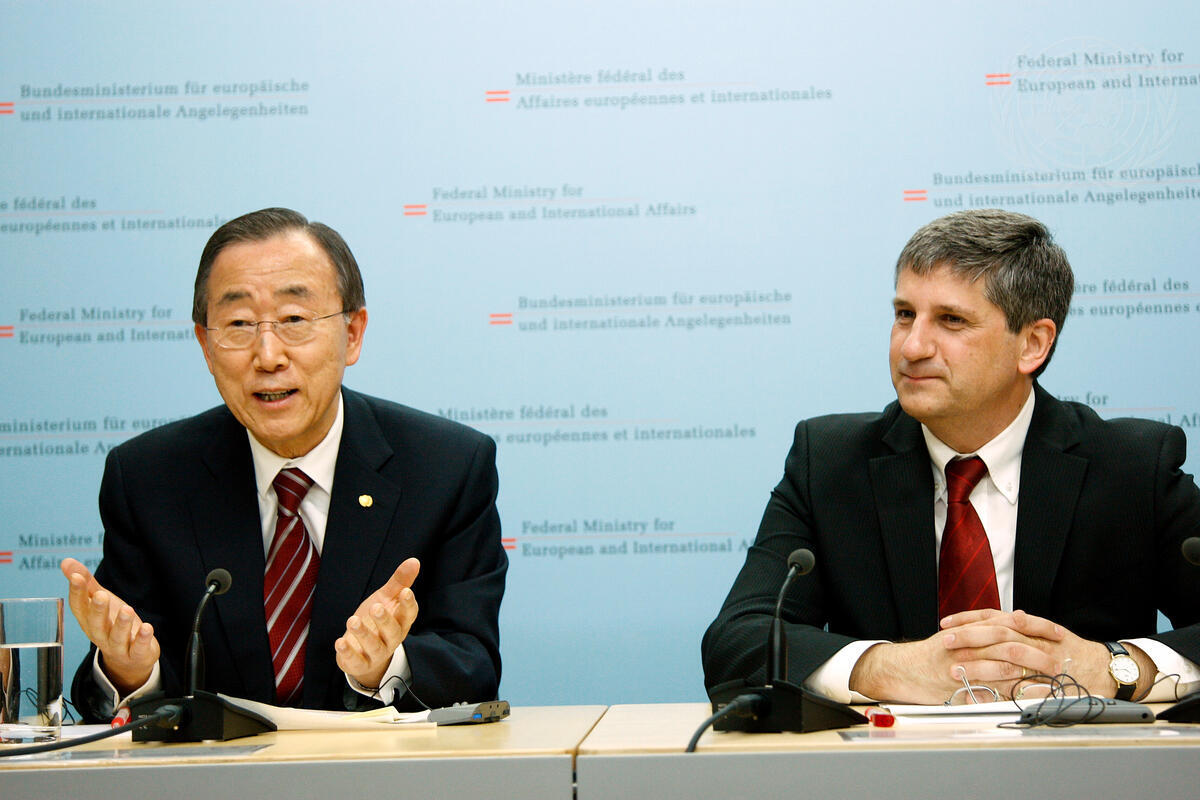 Secretary-General Ban Ki-moon (left) addresses a joint press conference with Michael Spindelegger, Federal Minister for European and International Affairs of Austria, in Austrian capital Vienna.