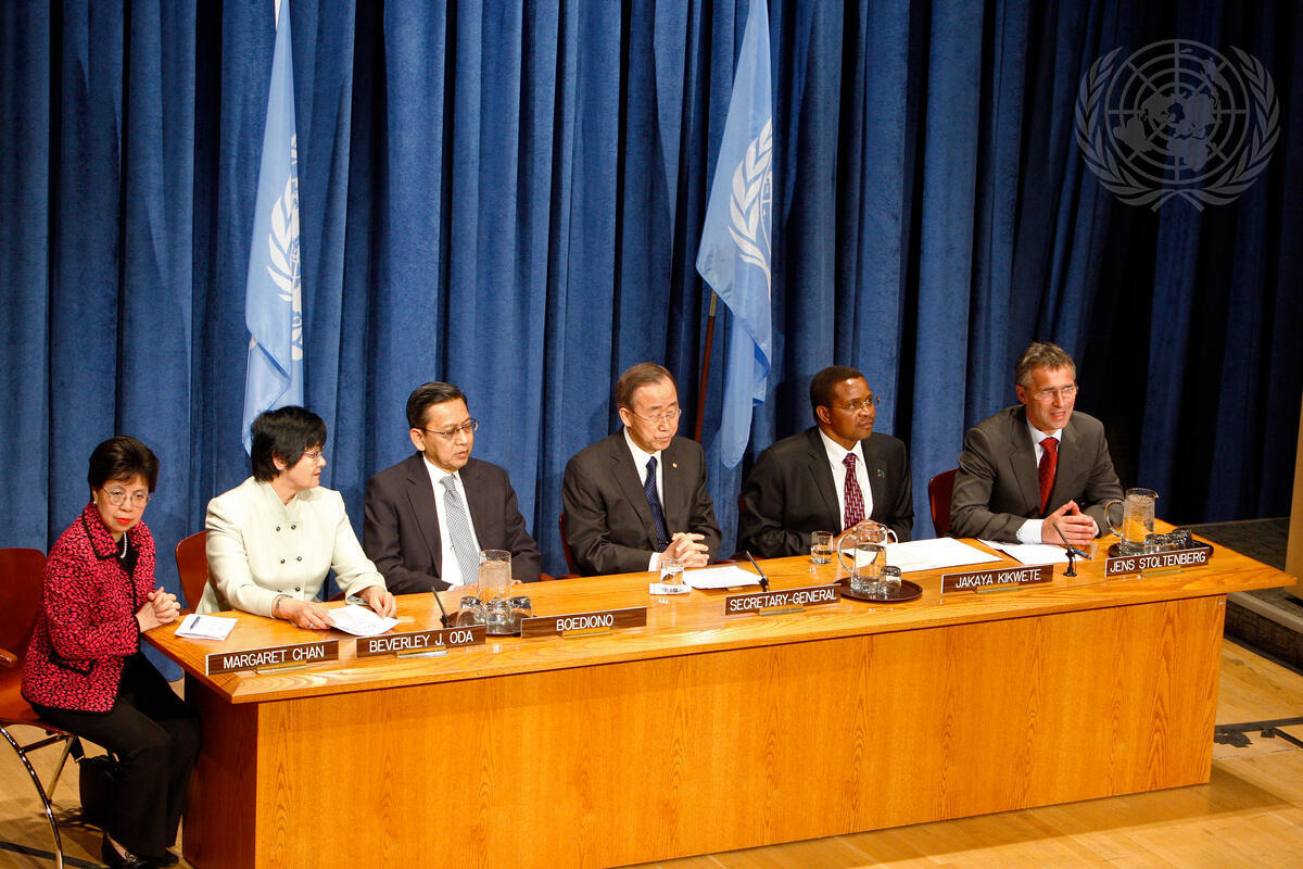 With him were (from left): Margaret Chan, Director-General of the World Health Organization; Beverly J. Oda, Minister for International Cooperation of Canada; Boediono, Vice-President of Indonesia; UN Secretary-General Ban Ki-moon; and Jakaya Mrisho Kikwete, President of Tanzania.