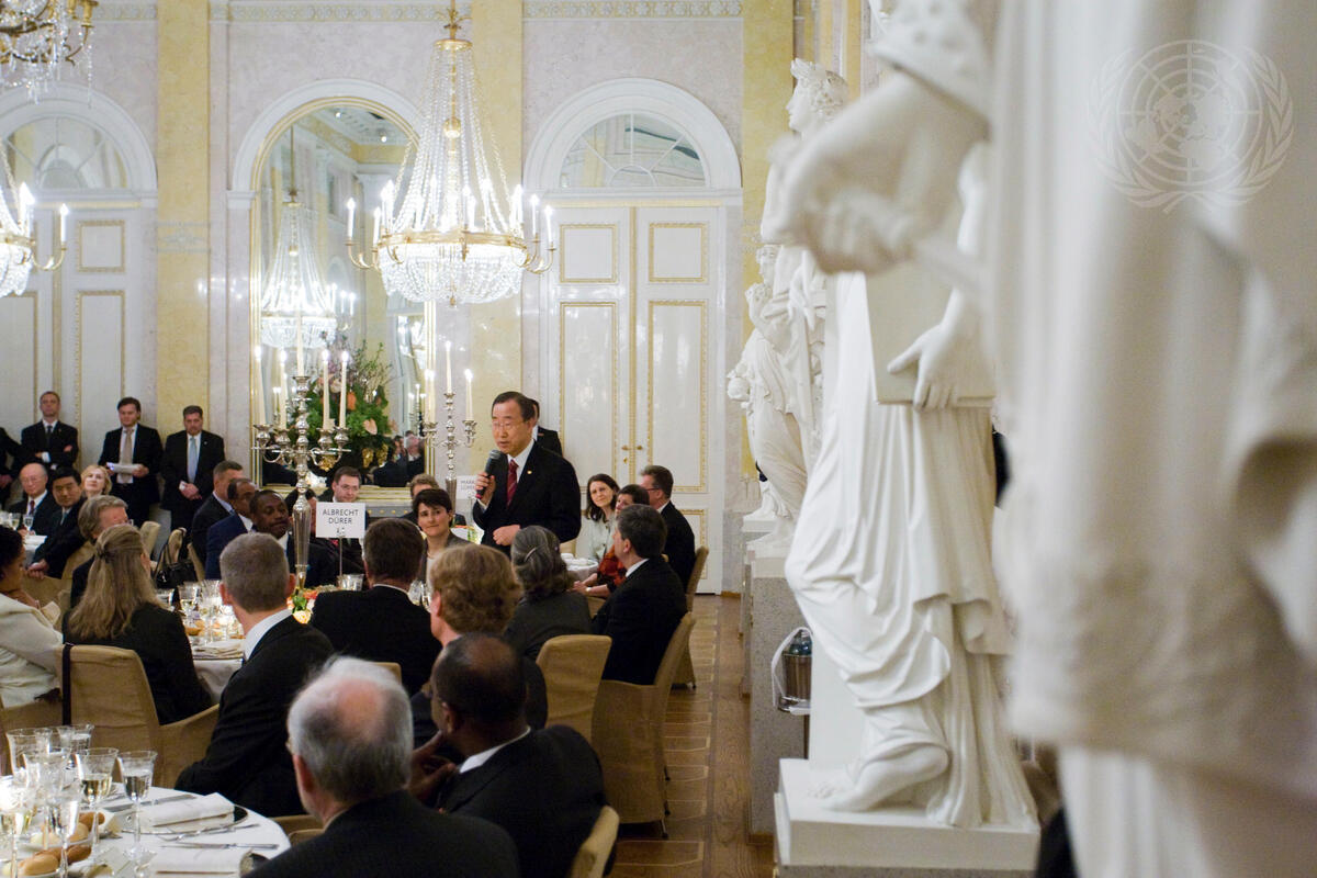 Secretary-General Ban Ki-moon (standing, with microphone) delivers a speech at a dinner hosted by Michael Spindelegger, Austria's Federal Minister for European and International Affairs, inside the Hall of the Muses at the Albertina palace, in Vienna, Austria.