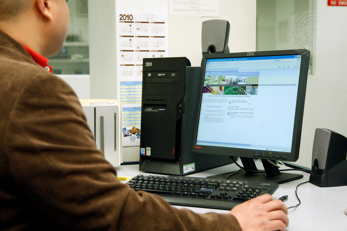 A staff member researching the database at the UN Archives and Records Management Section (ARMS). ARMS ensures that the UN and the public have ready access to records that document the history of the United Nations.