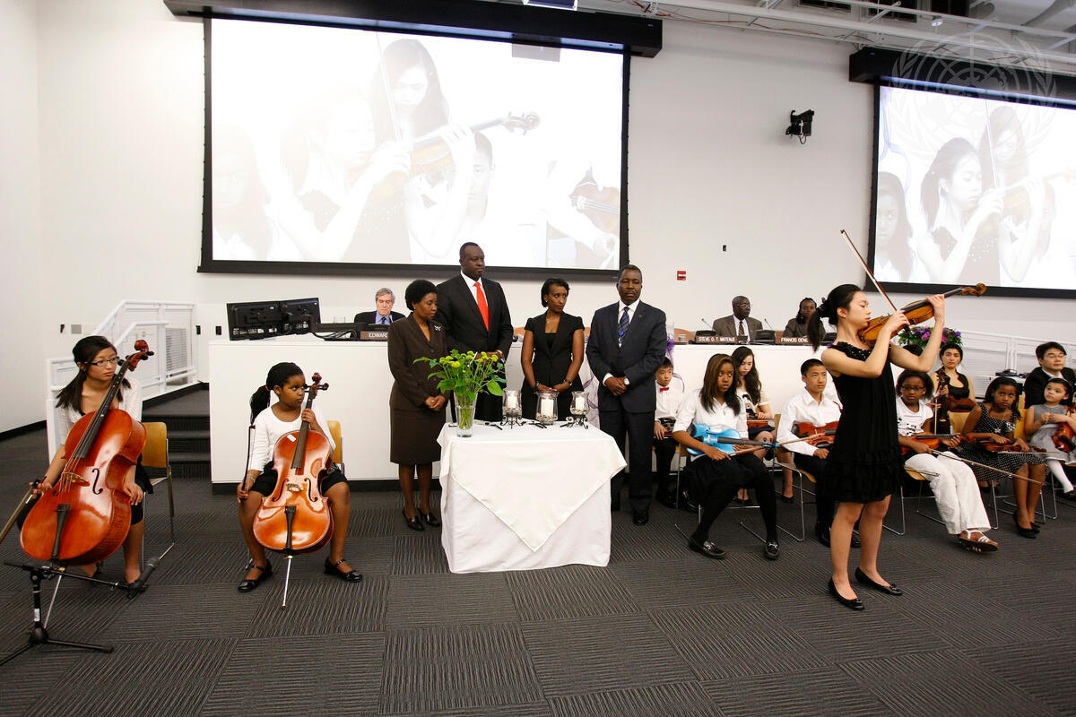Shortly after lighting candles in remembrance of the victims of the 1994 Rwandan genocide, (standing from left to right) Deputy Secretary-General Asha Rose-Migiro; Eugène-Richard Gasana, Permanent Representative of the Republic of Rwanda to the United Nations; Mr. Gasana's wife, Agnès Gasana; and Steve Dick Tennyson Matenje, Permanent Representative of the Republic of Malawi to the United Nations; listen to a young musician from New York's Mozart Academy perform a moving solo piece.