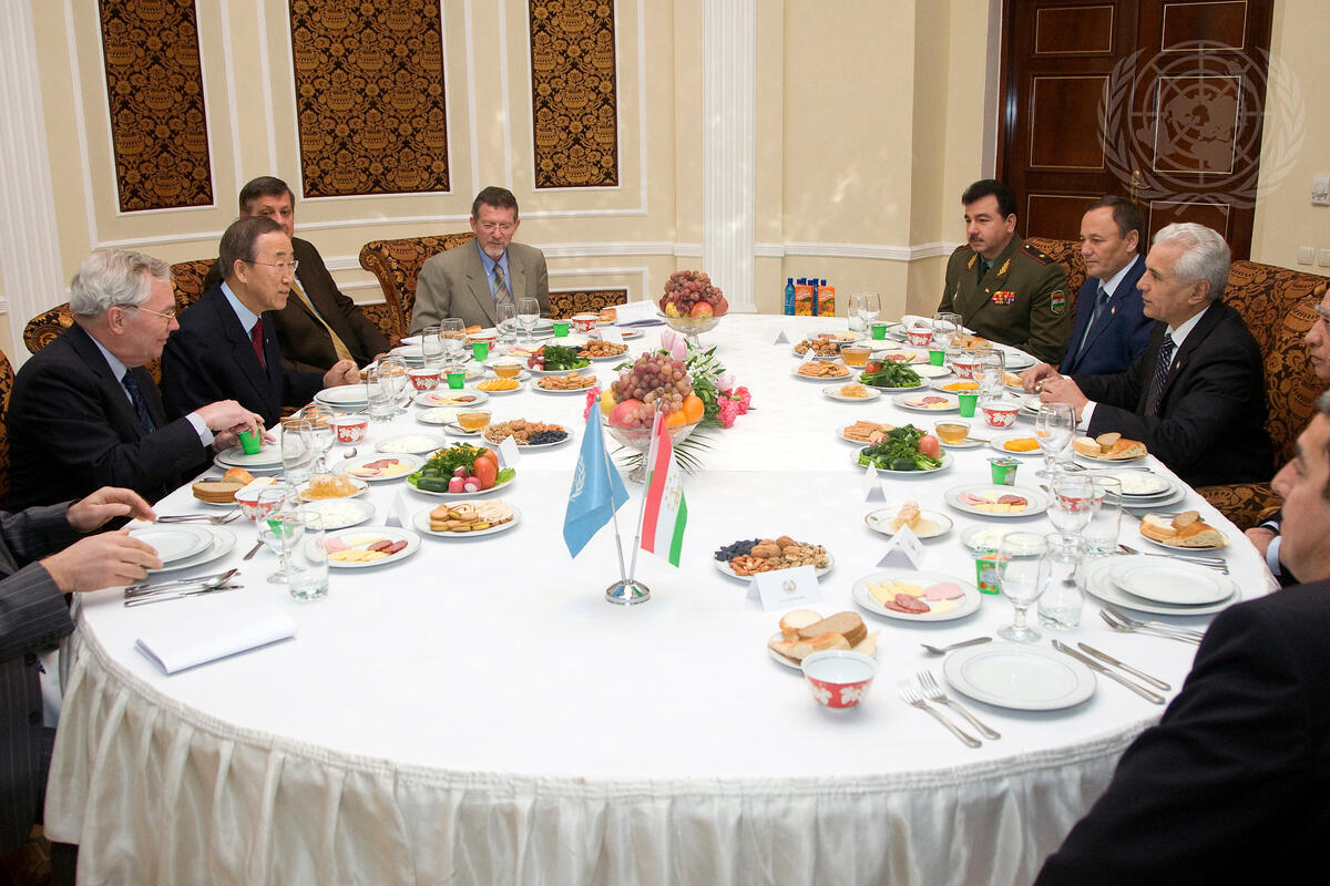 Secretary-General Ban Ki-moon (second from left), accompanied by Under-Secretary-General for Political Affairs B. Lynn Pascoe (left), attends a working breakfast with Hamrokhon Zarifi (right), Minister for Foreign Affairs of the Republic of Tajikistan, in Tajik capital Dushanbe.