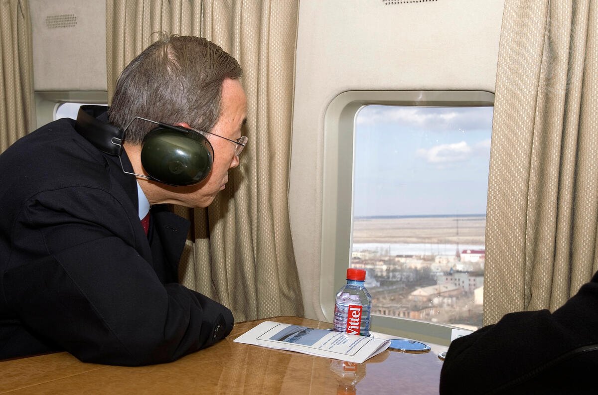 Secretary-General Ban Ki-moon takes in the view from his window as he flies via helicopter to Kurchatov, the Kazakh town home to the decommissioned Semipalatinsk nuclear test site.