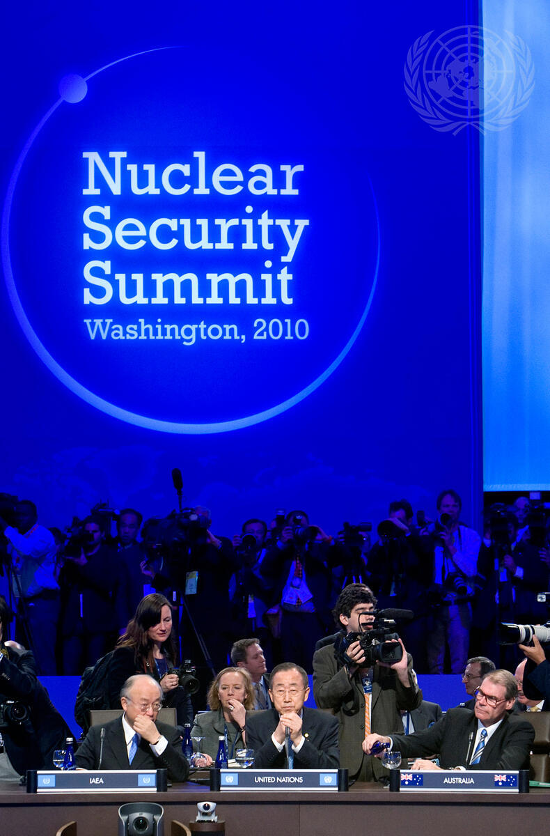 Secretary-General Ban Ki-moon (centre) attends the Nuclear Security Summit, hosted by U.S. President Barack Obama, at the Walter E. Washington Convention Center in Washington D.C. Mr. Ban is flanked by Yukiya Amano (left), Director General of the International Atomic Energy Agency (IAEA), and John Faulkner, Minister for Defence of Australia.