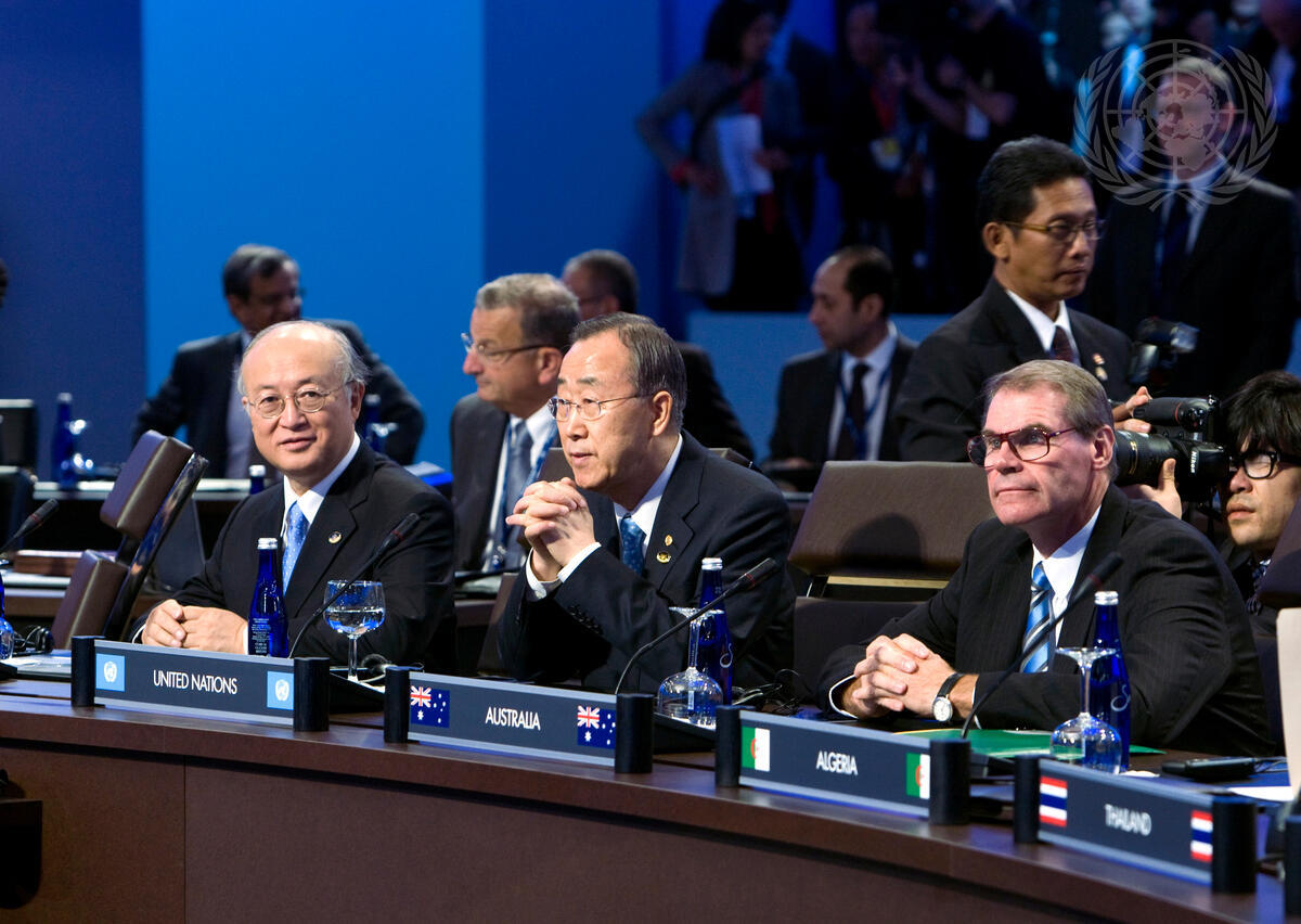 Secretary-General Ban Ki-moon (centre) attends the Nuclear Security Summit, hosted by U.S. President Barack Obama, at the Walter E. Washington Convention Center in Washington D.C. Mr. Ban is flanked by Yukiya Amano (left), Director General of the International Atomic Energy Agency (IAEA), and John Faulkner, Minister for Defence of Australia.