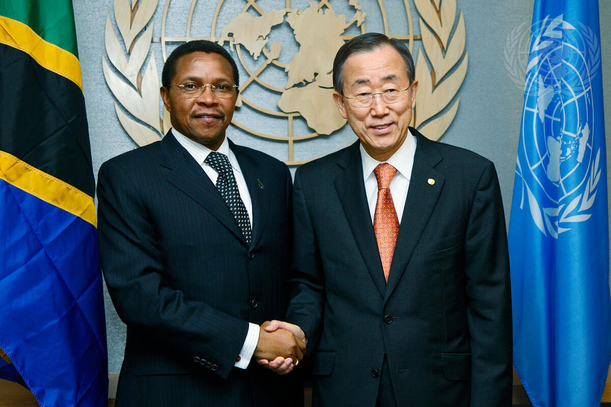 Secretary-General Ban Ki-moon (right) meets with Jakaya Mrisho Kikwete (centre), President of Tanzania.