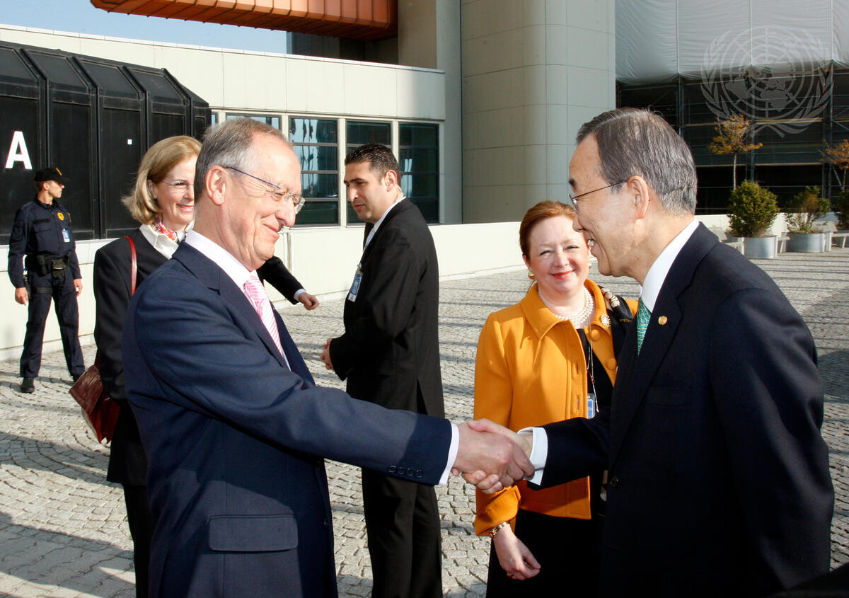 Secretary-General Ban Ki-moon (right) is met outside the Vienna International Centre by Antonio Maria Costa, Executive Director of the United Nations Office on Drugs and Crime (UNODC) and Director-General of the United Nations Office in Vienna (UNOV).