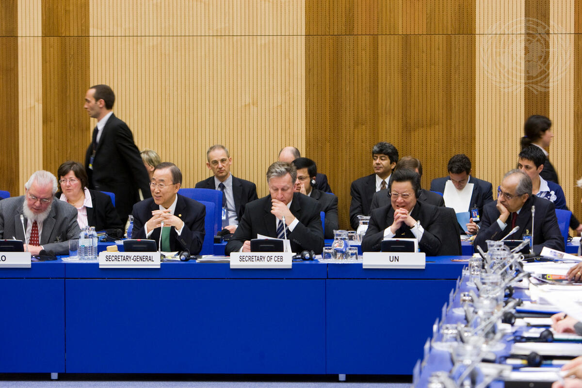 Secretary-General Ban Ki-moon (second from left) addresses an afternoon session of the UN System Chief Executives Board for Coordination (CEB) at the Vienna International Centre, in Vienna, Austria. Mr. Ban is flanked by Juan Somavia (left), Director-General of the International Labour Organization, and Thomas Stelzer, Secretary of the CEB.