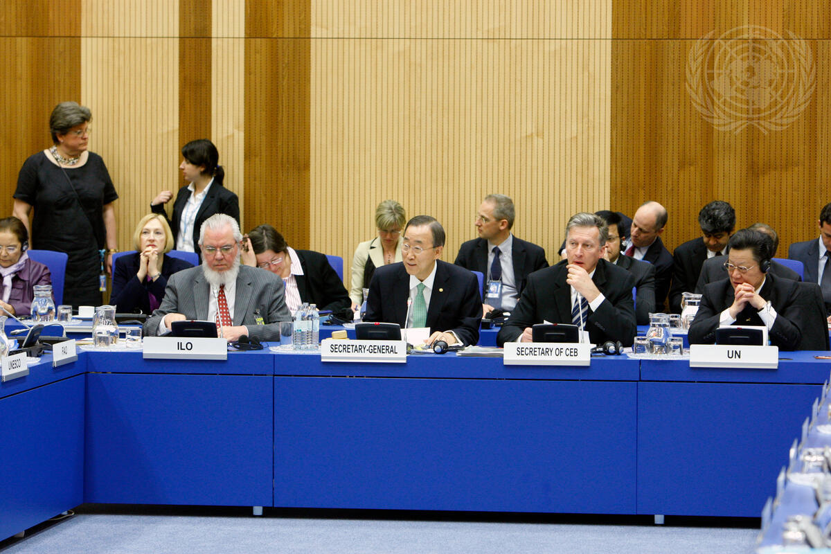 Secretary-General Ban Ki-moon (second from left) addresses an afternoon session of the UN System Chief Executives Board for Coordination (CEB) in Vienna, Austria. The CEB gathers the heads of the UN's 15 specialized agencies, 10 funds and programmes, and of the International Atomic Energy Agency and World Trade Organization.