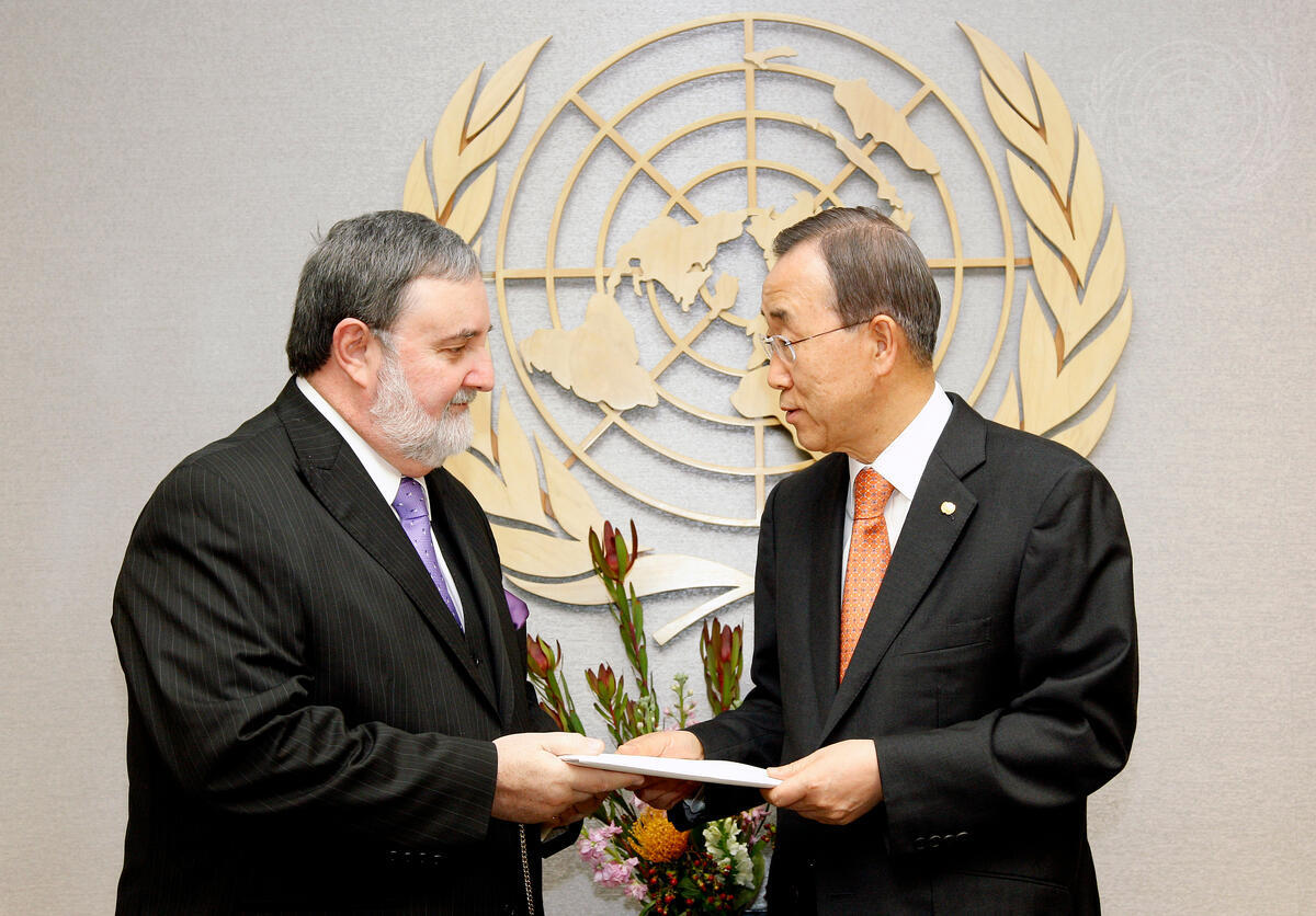 Secretary-General Ban Ki-moon (right) delivers the report of the Commission of Inquiry into the facts and circumstances of the assassination of former Pakistani Prime Minister Mohtarma Benazir Bhutto to Abdullah Hussain Haroon, Permanent Representative of Pakistan to the United Nations.