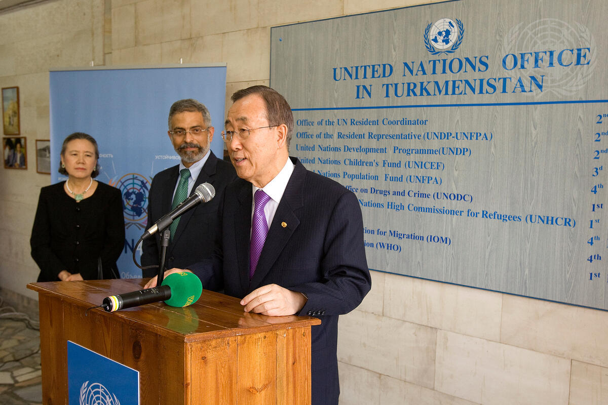 Secretary-General Ban Ki-moon addresses UN staff members at the United Nations Office in Ashgabat, Turkmenistan. To the left of Mr. Ban is Lenni Montiel, UN Resident Coordinator and United Nations Development Programme (UNDP) Resident Representative in Turkmenistan.