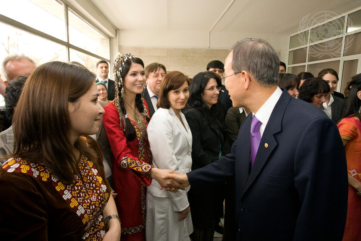 Secretary-General Ban Ki-moon (right) greets a United Nations staff member during a town hall meeting held by Mr. Ban with UN staff based in Ashgabat, Turkmenistan.