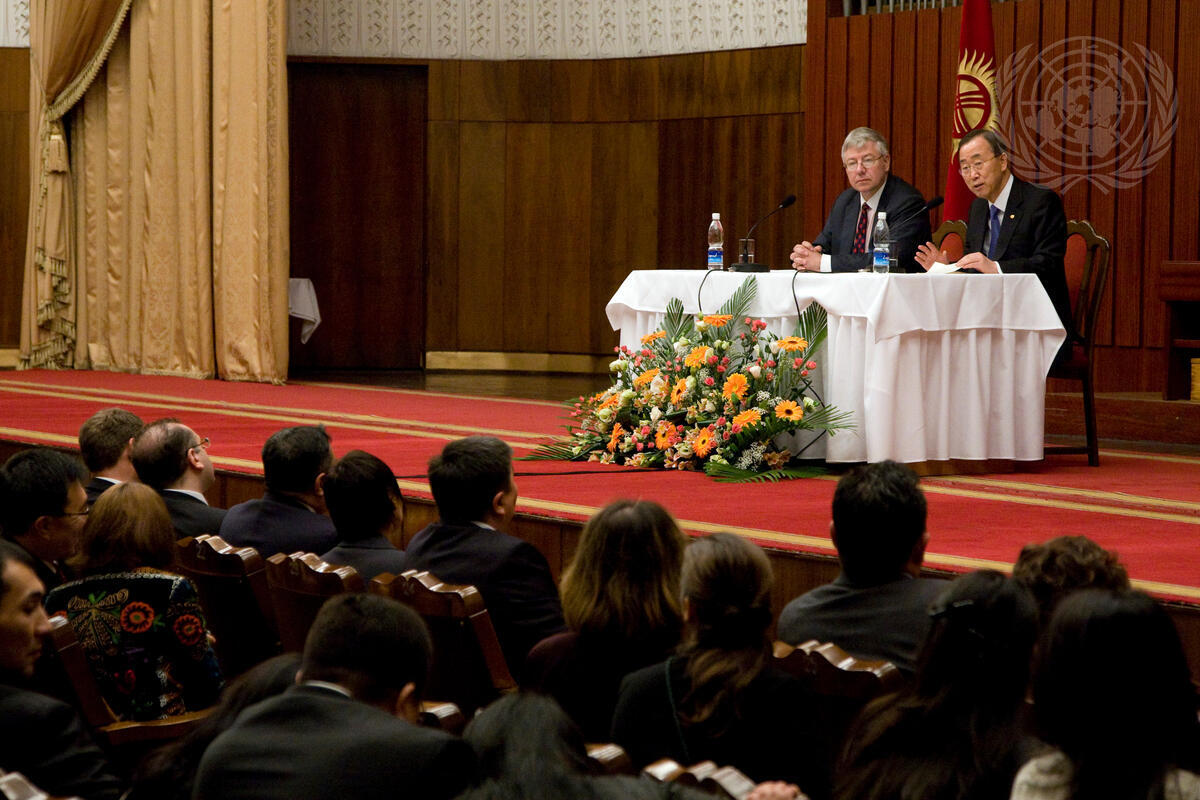 Secretary-General Ban Ki-moon (right) holds a town hall meeting with UN staff based in Bishkek, Kyrgyzstan, during his official visit to the Central Asian nation. With Mr. Ban is Neal Walker, UN Resident Coordinator in Kyrgyzstan.