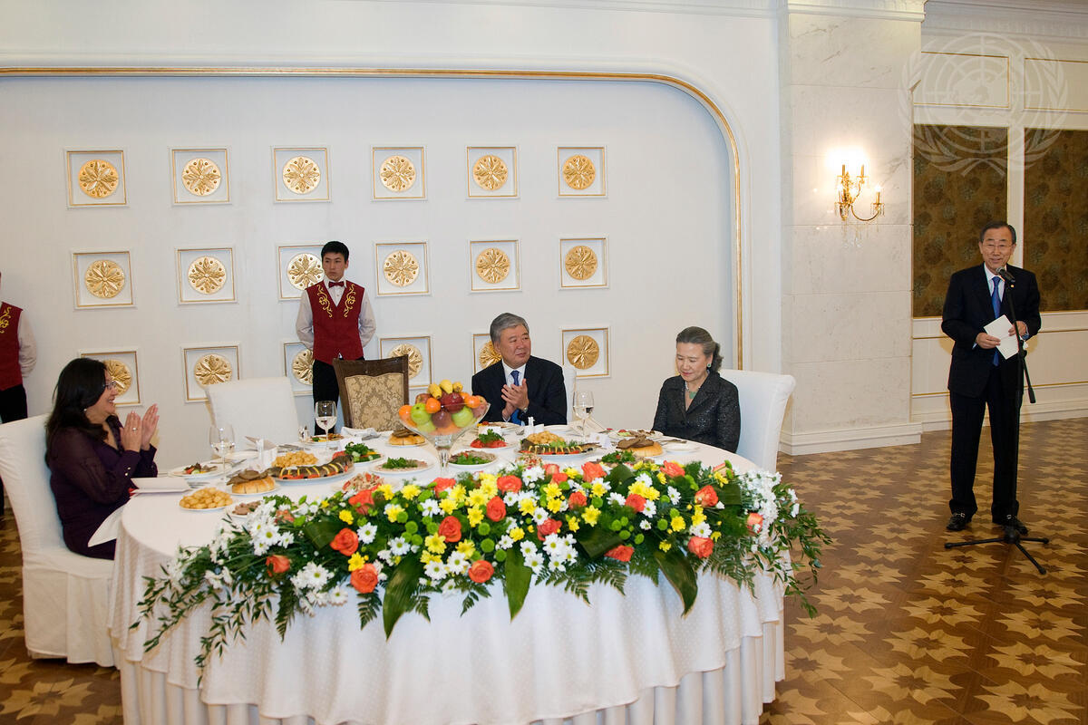 Secretary-General Ban Ki-moon (right, standing) addresses a dinner hosted by Daniyar Usenov (at table, centre), Prime Minister of the Kyrgyz Republic, held in honour of Mr. Ban and his wife, Yoo Soon-taek (at table, right), in Bishkek, Kyrgyzstan.