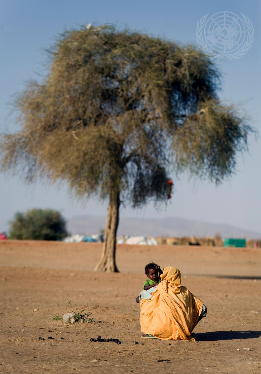 A woman crouches with her child in the area of Shangil Tobaya, Sudan, where many like her have settled to escape fighting in their native Darfur villages. The migrants have to contend with Shangil Tobaya's harsh landscape which provides little water or food.
