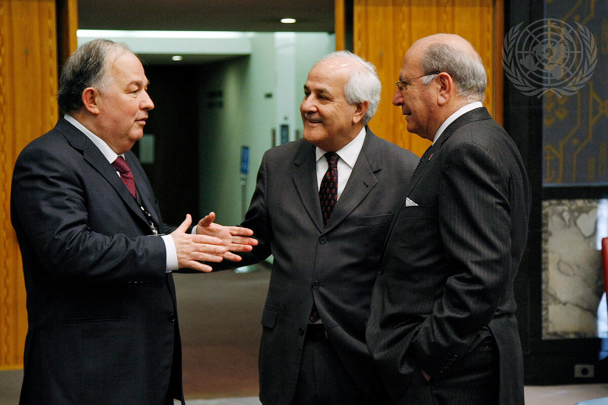 Ertugrul Apakan (left), Permanent Representative of Turkey to the United Nations, converses with Riyad H. Mansour (centre), Permanent Observer of Palestine to the United Nations, at a Security Council meeting on the situation in the Middle East and the question of Palestine.