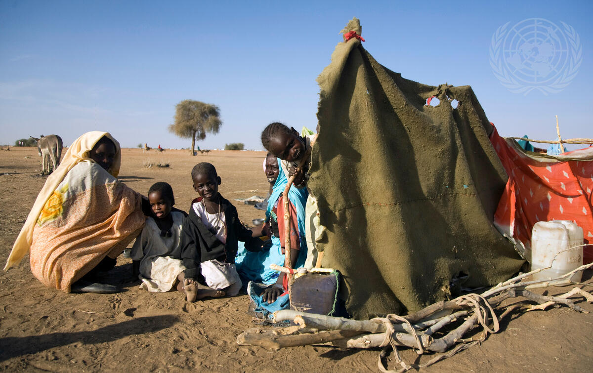 A family has constructed a makeshift shelter in the area of Shangil Tobaya, Sudan, after migrating from their village in Darfur where fighting is ongoing. Thousands like the family pictured here, mostly women and children, have escaped to Shangil Tobaya, contending with a harsh landscape which provides little water or food.