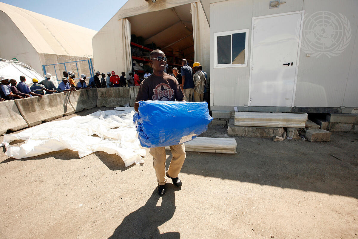 Haitian UN staff members who have lost their homes in the earthquake queue outside a warehouse where the United Nations Stabilization Mission in Haiti (MINUSTAH) distributes tents for temporary shelter.