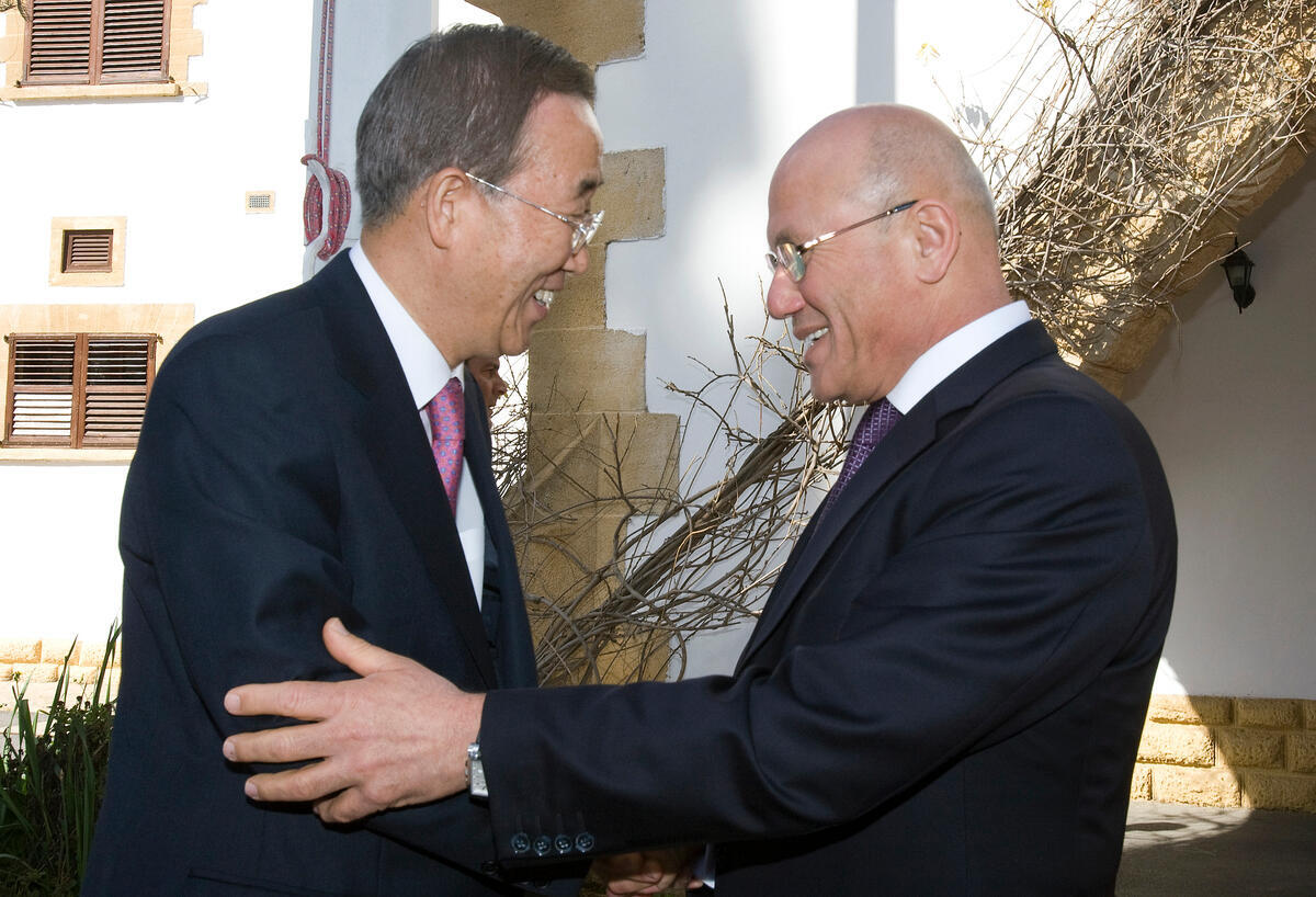Secretary-General Ban Ki-moon (left) meets with Turkish Cypriot leader Mehmet Ali Talat in Nicosia, Cyprus.