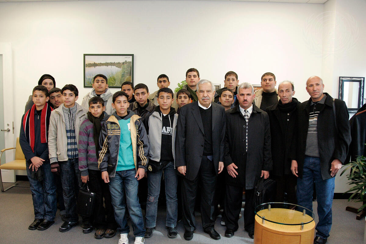 Ali Abdussalam Treki (front, fourth from right), President of the sixty-fourth session of the General Assembly, poses for a group photo with students and teachers from a school in the Gaza strip operated by the the United Nations Relief and Works Agency for Palestine Refugees in the Near East (UNRWA). The students were the top performers in a programme on human rights, tolerance and peaceful conflict resolution.