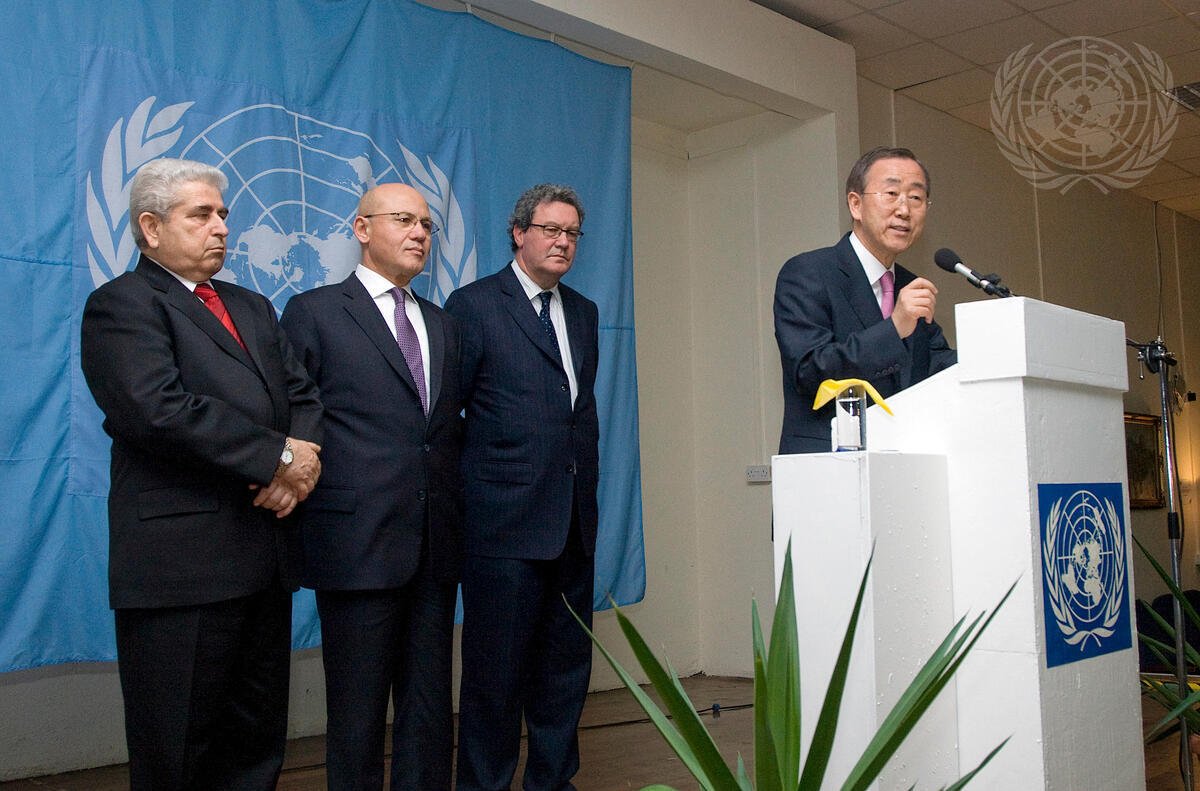 Secretary-General Ban Ki-moon (at podium) hosts a reception for President of the Republic of Cyprus Dimitris Christofias (left), Turkish Cypriot leader Mehmet Ali Talat (second from left), local political party leaders, and members of the diplomatic community and of civil society, in Nicosia, Cyprus.