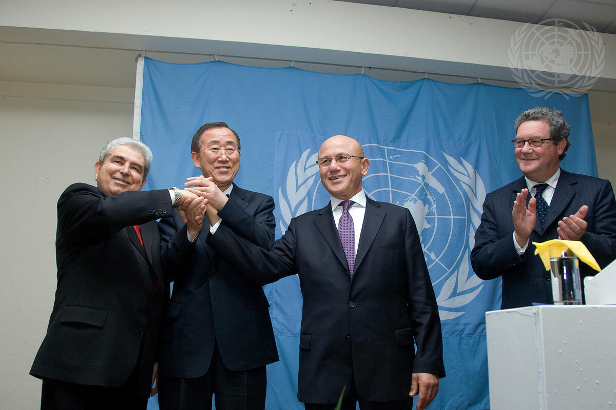 Secretary-General Ban Ki-moon (second from left) joins hands with Dimitris Christofias (left), President of the Republic of Cyprus, and Turkish Cypriot leader Mehmet Ali Talat (second from right) at a reception hosted by Mr. Ban in Nicosia, Cyprus. At right is Alexander Downer, Special Adviser to the Secretary-General on Cyprus.