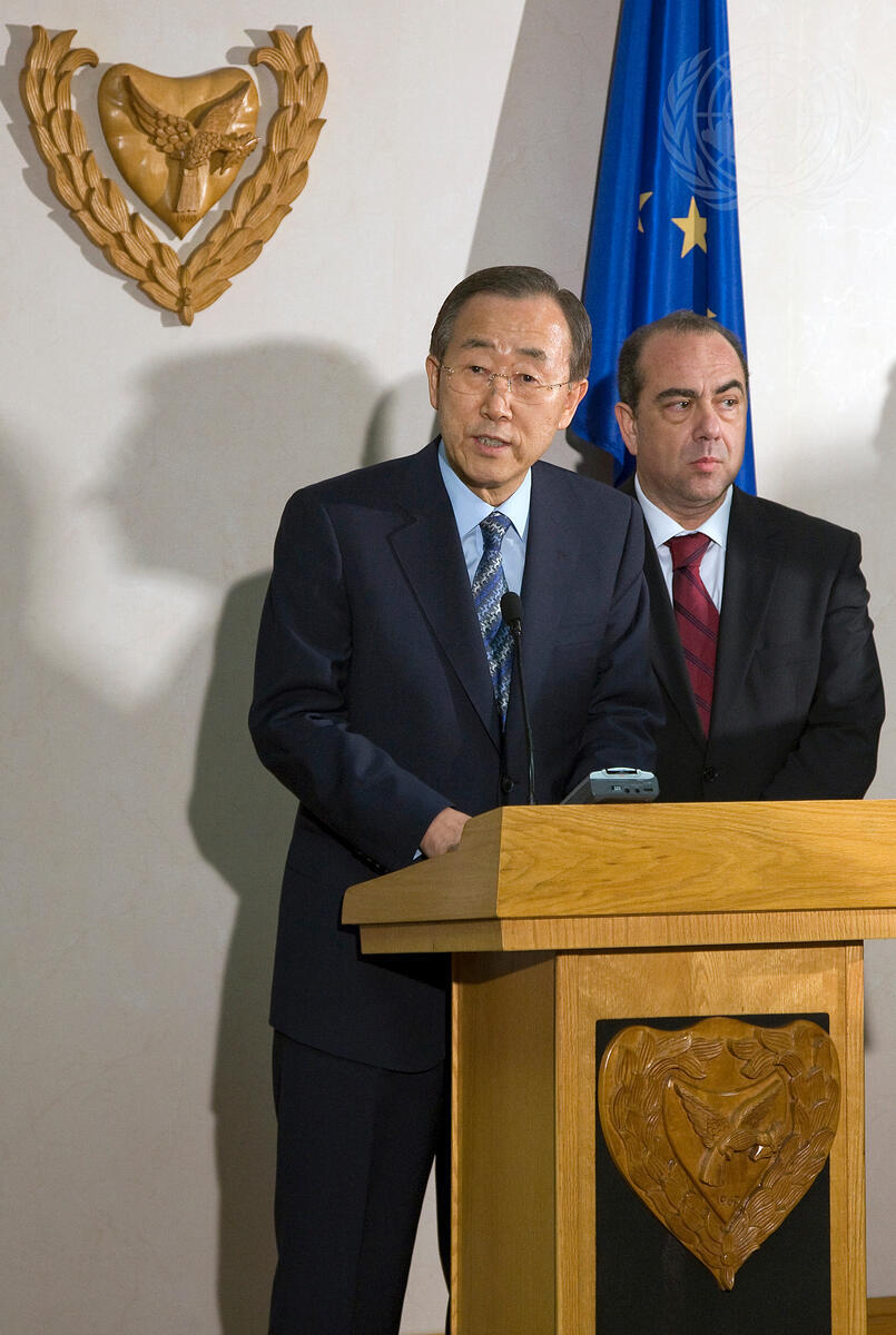Secretary-General Ban Ki-moon speaks to journalists shortly after his arrival in Larnaca, Cyprus. Behind Mr. Ban is Markos Kyprianou, Minister for Foreign Affairs of the Republic of Cyprus.