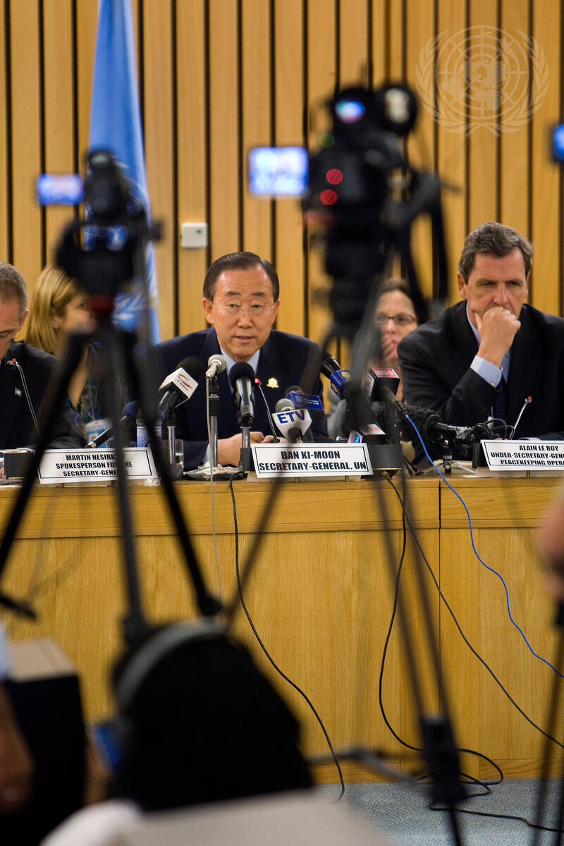 Secretary-General Ban Ki-moon (centre) holds a press conference at the end of his stay in Addis Ababa, Ethiopia, where he attended the African Union Summit. Seated at right is Alain Le Roy, Under-Secretary-General for Peacekeeping Operations.