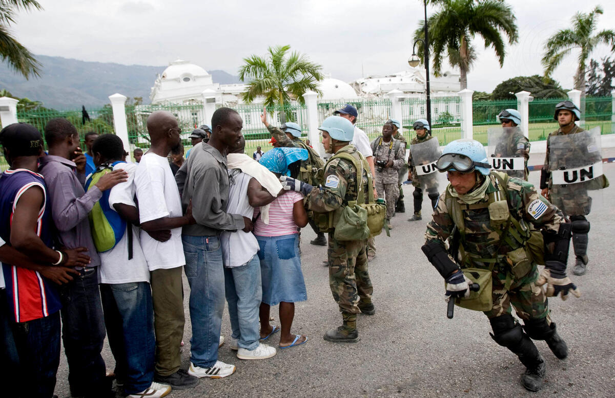 Uruguayan UN peacekeepers maintain order and provide security during a food distribution in downtown Port-au-Prince, Haiti. Behind them is Haiti's Presidential Palace, in a state of near-collapse.