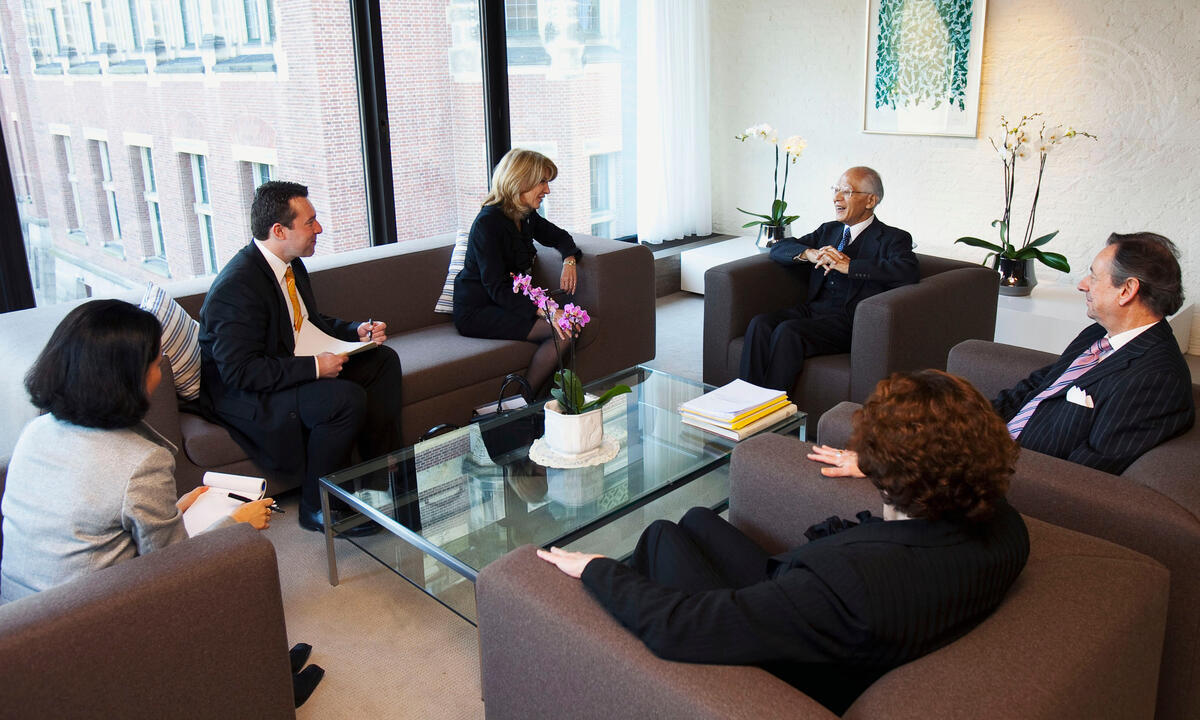 Patricia O'Brien (third from left), Under-Secretary-General for Legal Affairs and United Nations Legal Counsel, paid an official visit to the International Court of Justice (ICJ), the UN's principal judicial organ, based in The Hague, Netherlands, to meet with Members of the Court and other ICJ officials. Here, Ms. O'Brien is seen with ICJ President Hisashi Owada (centre) and Registrar of the Court Philippe Couvreur (right) in the President's office.