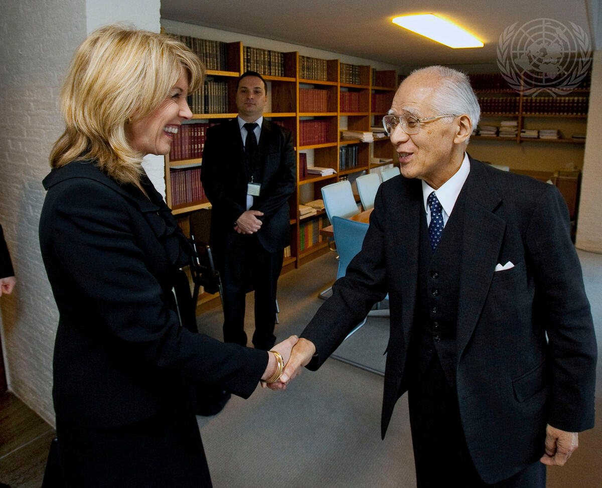 Patricia O'Brien (left), Under-Secretary-General for Legal Affairs and United Nations Legal Counsel, paid an official visit to the International Court of Justice (ICJ), the UN's principal judicial organ, based in The Hague, Netherlands, to meet with Members of the Court and other ICJ officials. Here, Ms. O'Brien is seen meeting with ICJ President Hisashi Owada in the President's office.