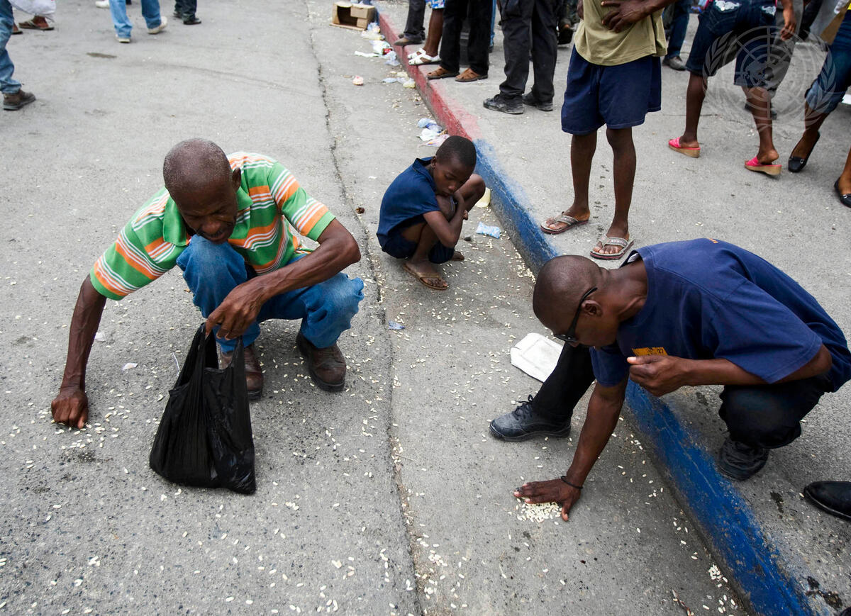 Haitians collect spilled beans after an emergency relief food distribution in Port-au-Prince.
