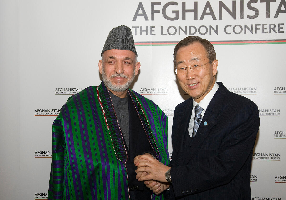 Secretary-General Ban Ki-moon (right) meets with Hamid Karzai, President of Afghanistan, at the London Conference on Afghanistan.