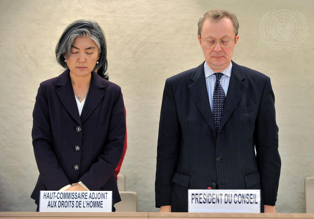Kyung-wha Kang, Deputy High Commissioner for Human Rights (left), and Alex Van Meeuwen, Permanent Representative of Belgium to the United Nations Office at Geneva and President of the Human Rights Council, observe a moment of silence for the victims of Haiti's earthquake during a special session of the Council in Geneva, Switzerland.