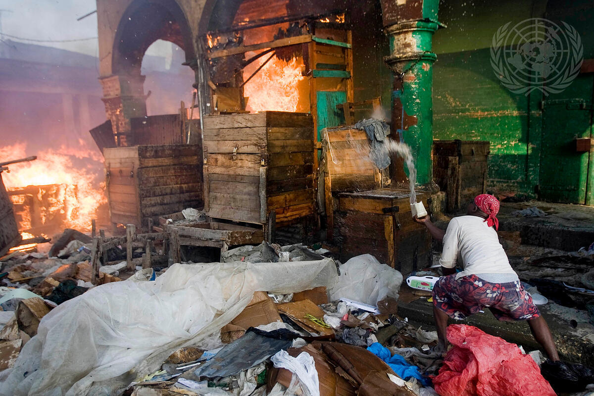 A man throws water on a fire engulfing stores in downtown Port-au-Prince, Haiti. Ever since the earthquake, fires have been a frequent occurrence in the capital city.