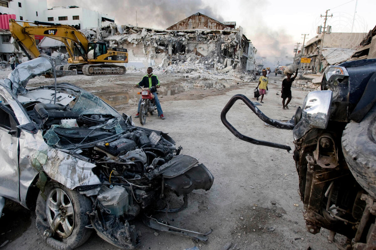 Haitians walk through the earthquake-ravaged streets of downtown Port-au-Prince.