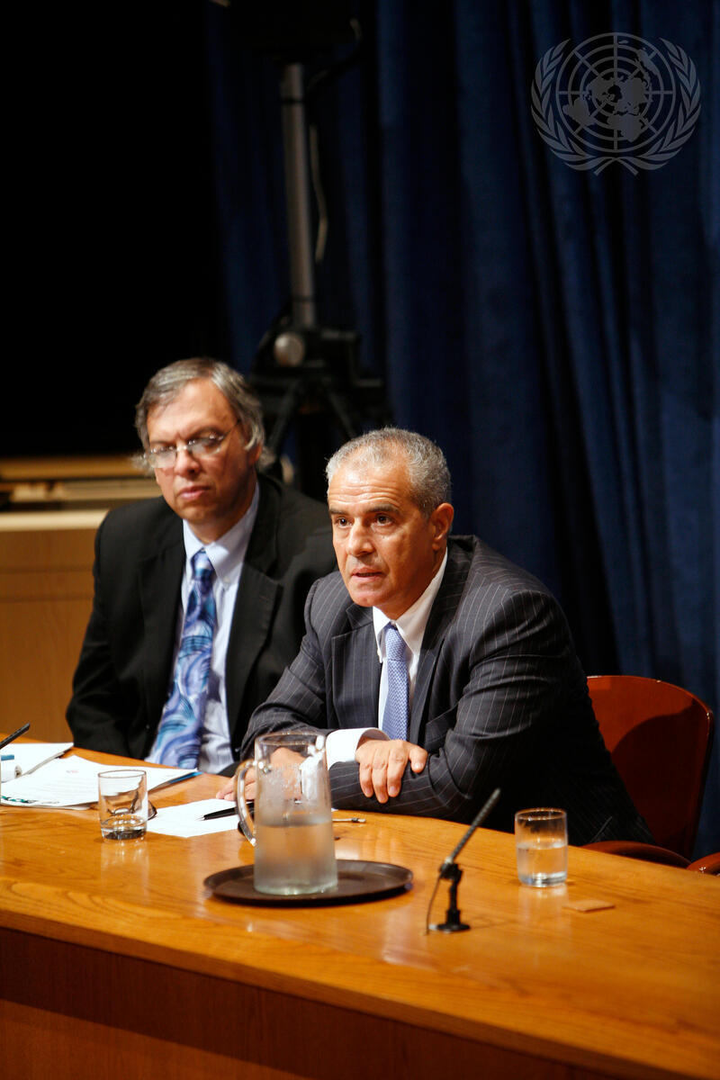 Ahmed Djoghlaf, Executive Secretary of the Convention on Biological Diversity, briefs reporters at a press conference on the dangers of global loss of biodiversity. At left is Dan Shepard of the Department of Public Information, moderator of the press conference.