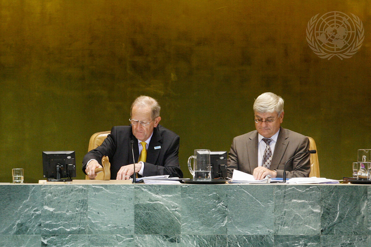 Joseph Deiss (left), President of the sixty-fifth session of the General Assembly, closes the Assembly's High-level meeting as a contribution to the International Year of Biodiversity. At right is Ion Botnaru, Director of the General Assembly and ECOSOC Affairs Division of the Department for General Assembly and Conference Management.