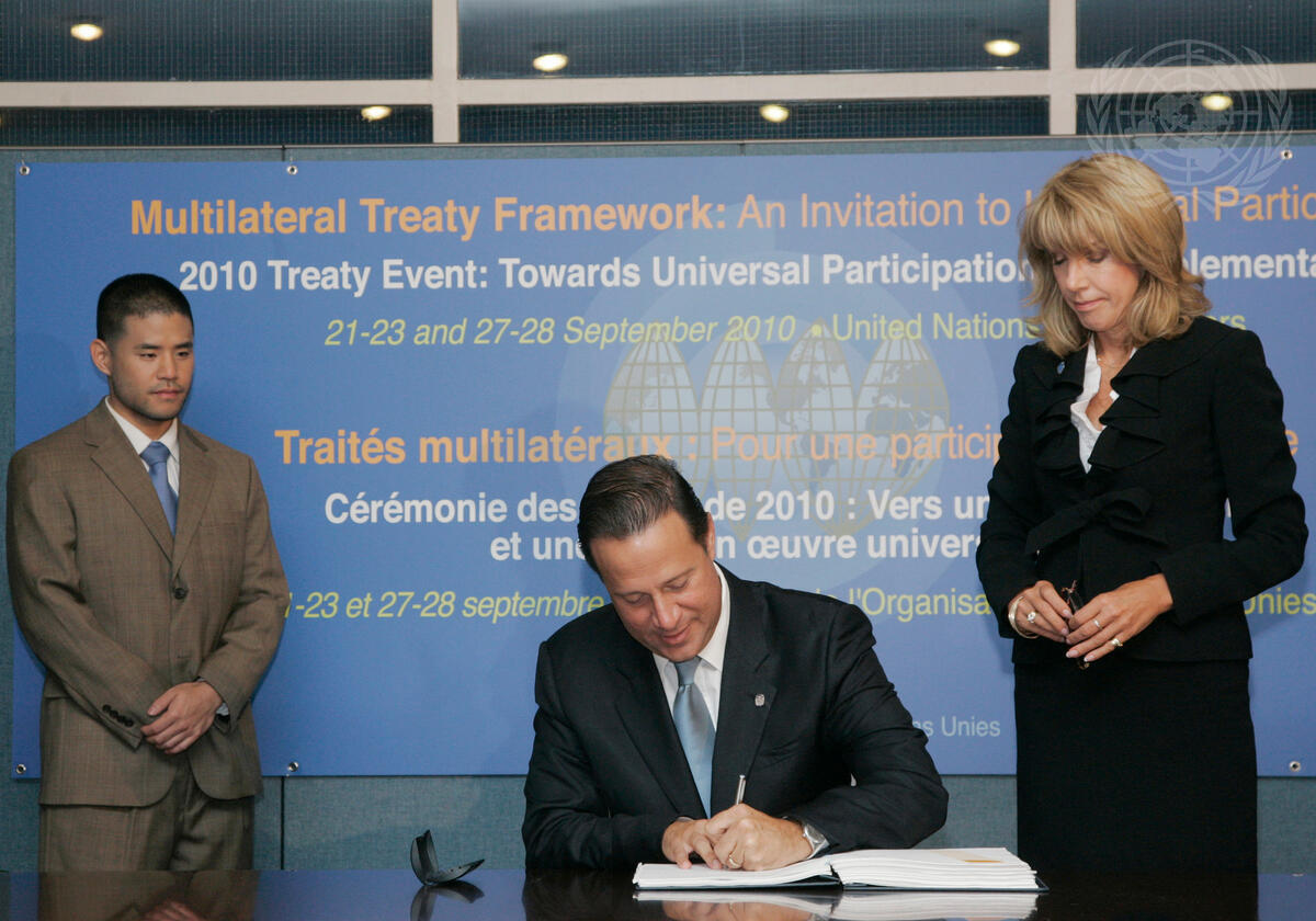 Juan Carlos Varela Rodríguez, Minister for Foreign Affairs of Panama, signs the Optional Protocol Against Torture, with Patricia O’Brien, Under-Secretary-General for Legal Affairs, standing by.