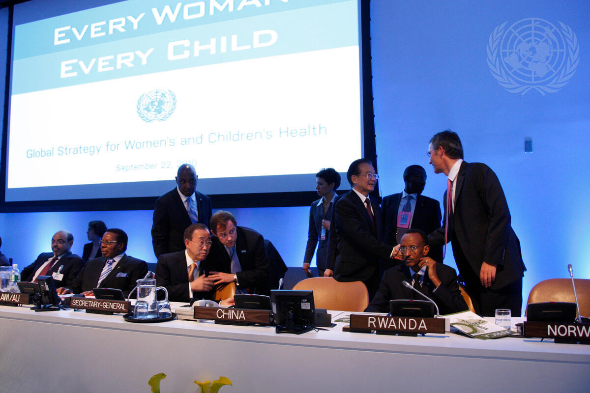 A view of the speakers’ panel at the launch of the Global Strategy for Women’s and Children’s Health, “Every Woman, Every Child”. From left: Meles Zenawi, Prime Minister of Ethiopia; Bingu Wa Mutharika, President of Malawi; Secretary-General Ban Ki-moon; Robert Orr (speaking privately with Mr. Ban), Assistant Secretary-General for Policy Coordination and Strategic Planning; Wen Jiabao (standing), Premier of China; Paul Kagame, President of Rwanda; and Jens Stoltenberg (standing), Prime Minister of Norway.