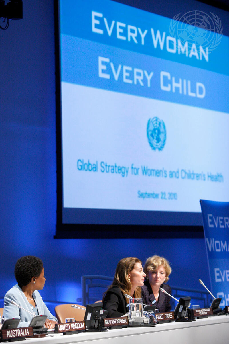 Melinda Gates, Co-founder and Co-chair of the Bill and Melinda Gates Foundation, addresses the launch of the Global Strategy for Women’s and Children’s Health, “Every Woman, Every Child”. She is flanked by Deputy Secretary-General Asha-Rose Migiro (left) and Sherilyn McCoy, Worldwide Chairman of Johnson & Johnson Pharmaceuticals.